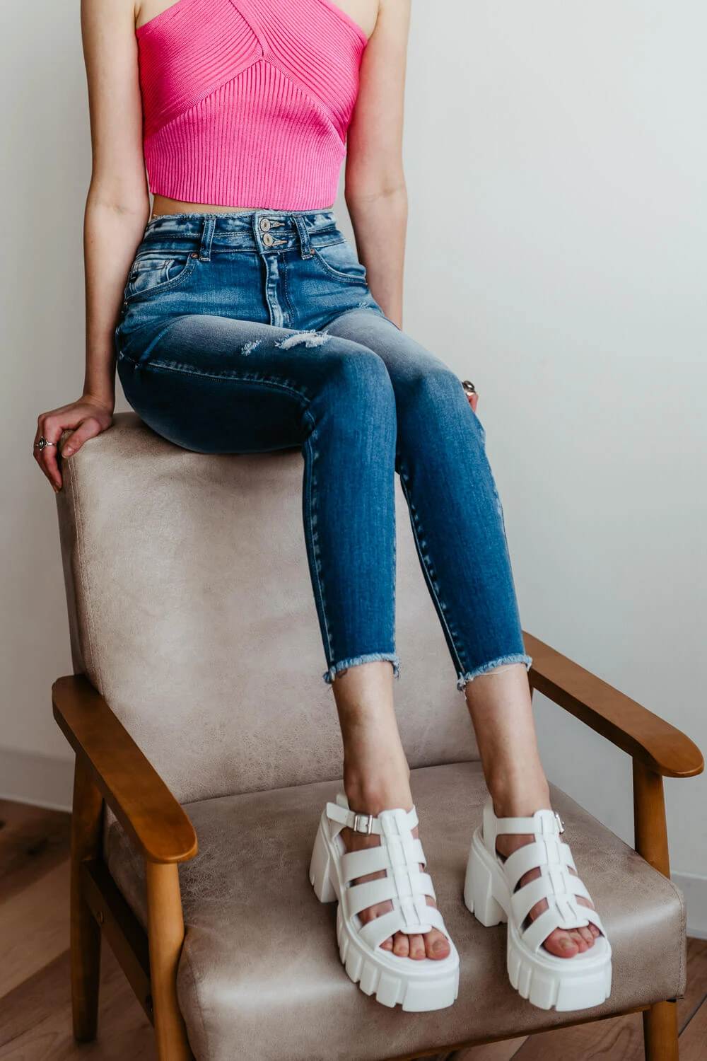 - Ankle length with frayed hem